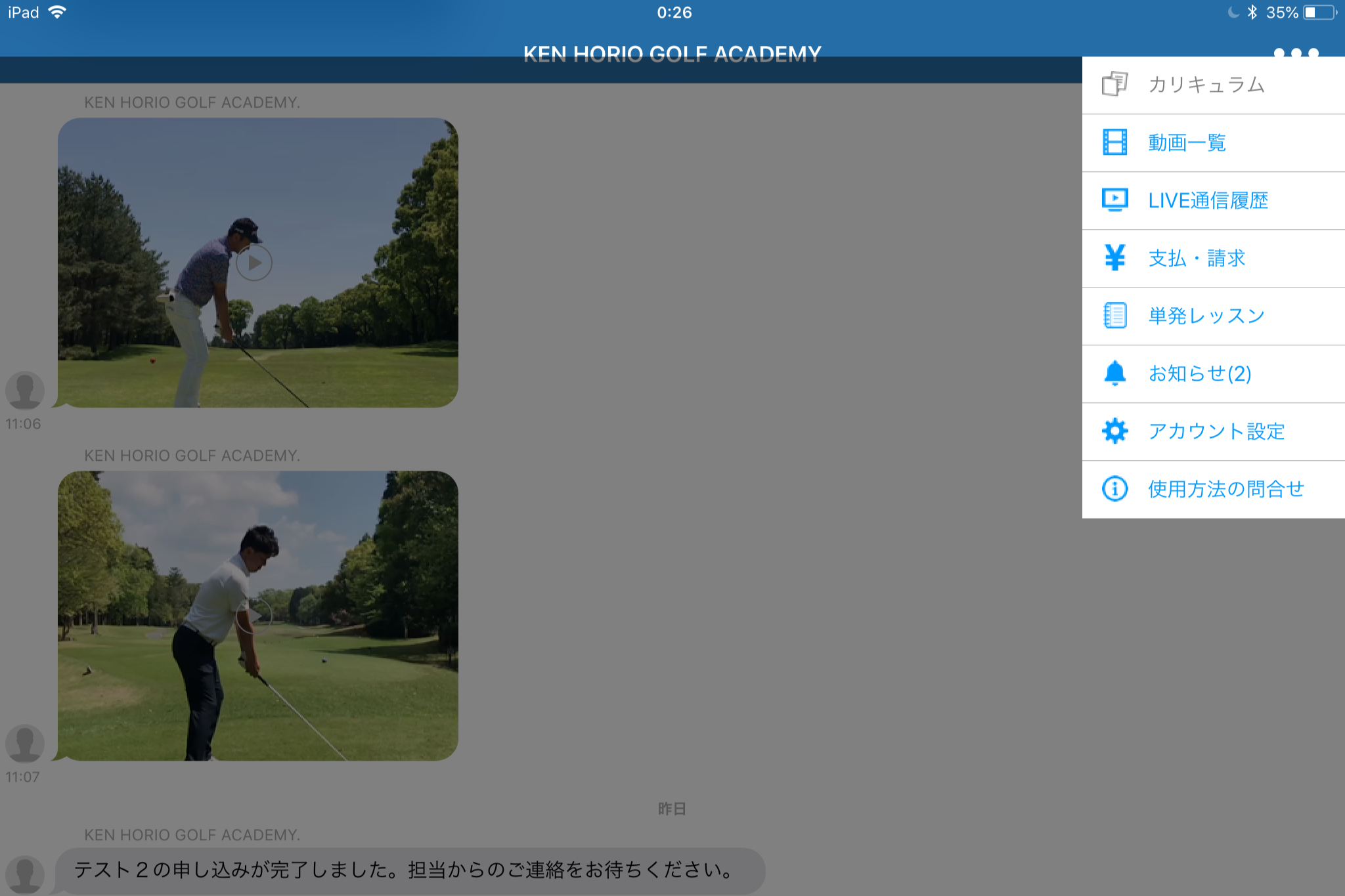 48時間以内に添削されたレッスン動画がトーク画面にアップロードされます。受信の為の作業はありません。現在必要な動作や練習方法をコーチがアドバイスします。